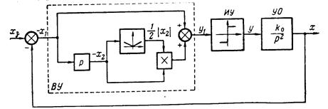 Теперь, зная уравнение линии переключения, можно синтезировать оптимальное управляющее устройство (рис. 6.6). Оно состоит из двухпозиционного исполнительного устройства ИУ и вычислительного устройства ВУ.