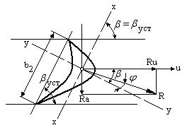 Угол b для активных ступеней невелик, поэтому можно принять, что Ru действует нормально к оси минимального момента инерции лопатки (х.х) и что изгиб рабочей лопатки происходит только относительно (вокруг) этой оси. Напряжением изгиба относительно максимального момента инерции y.y можно пренебречь из-за малой величины Ra и достаточно большой жесткости лопатки в этом направлении.