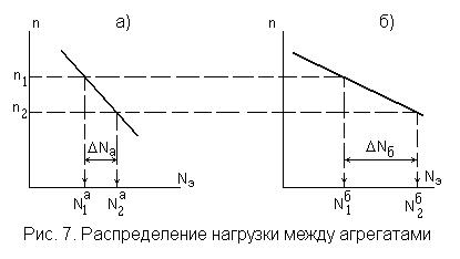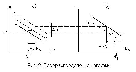 Пусть при подключении новых потребителей частота в системе снизилась с n1 до n2. Первый турбоагрегат (рис.7 а) при этом примет нагрузку DNa, а второй (рис. 7 б) – DNб. При этом