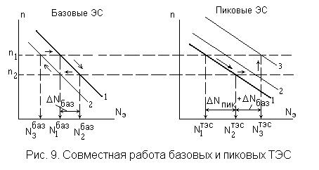 При аварийном снижении частоты в энергосистеме с n1 до n2 оба агрегата, участвуя в первичном регулировании частоты, примут на себя дополнительную нагрузку: базовый агрегат – DNбаз, пиковый – DNпик. Затем базовая с помощью регулятора мощности, воздействуя на МУТ, переведет характеристику из положения 1 в положение 2, вернув турбину к заданной мощности N1баз. Одновременно на пиковой ЭС производится воздействие на МУТ турбины таким образом, чтобы снятая с турбины нагрузка DNбаз была воспринята турбиной пиковой. Таким образом, эта турбина догрузится до N3ТЭСбаз и обе турбины будут работать при пониженной частоте n2. Для того, чтобы поднять частоту до прежней n1, необходимо еще больше открыть регулирующие клапаны пиковой турбины с помощью МУТ, т.е. переместить характеристику из положения 2 в 3, тогда при постоянной мощности N3ТЭС частота поднимется до n1. Это повышение частоты вызовет работу АСР базовой турбины, которая автоматически разгрузится до N3баз, а затем регулятор мощности, воздействуя через МУТ на регулирующий клапан этой турбины, переместит характеристику АСР из положения 2 в положение 1 и восстановит мощность турбины до первоначального уровня N1баз.