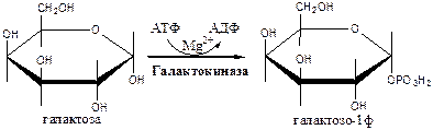 Галактокиназа (АТФ: галактозо-1-фосфотрансфераза) фосфорилирует галактозу.