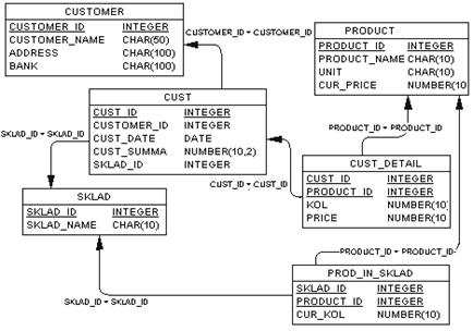 На данной диаграмме каждая сущность представляет собой таблицу базы данных, каждый атрибут становится колонкой соответствующей таблицы. Обращаем внимание на то, что во многих таблицах, например, «CUST_DETAIL» и «PROD_IN_SKLAD», соответствующих сущностям «Запись списка накладной» и «Товар на складе», появились новые атрибуты, которых не было в концептуальной модели – это ключевые атрибуты родительских таблиц, мигрировавших в дочерние таблицы для того, чтобы обеспечить связь между таблицами посредством внешних ключей.