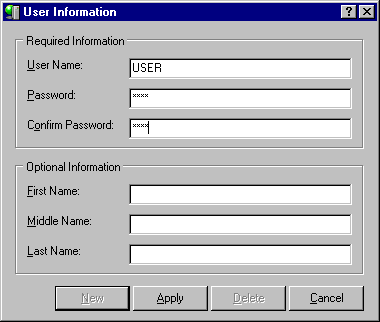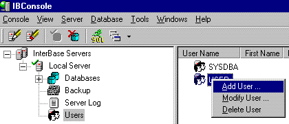 Запустите консоль \IBConsole.exe. В меню Server выберете пункт Login, в поле User Name записать: “SYSDBA”, в поле Password записать: “masterkey” (это имя и пароль администратора БД по умолчанию). Сервер при этом должен быть запущен. В раскрывшемся списке выберете пункт Users, в списке пользователей выберете любого пользователя и правой клавишей мыши активизируйте контекстное меню, выбрав в нем пункт add user... ведите имя “USER” и пароль “user”.