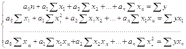 Параметры уравнения множественной регрессии, как и парной, рассчитываются методом наименьших квадратов на основе решения системы нормальных уравнений. Для линейного уравнения регрессии с п факторами строится система из (n+1) нормальных уравнений:
