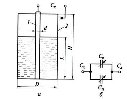 Рис. 2.45. Контроль уровня емкостным методом: а — схема контроля; б — схема замещения