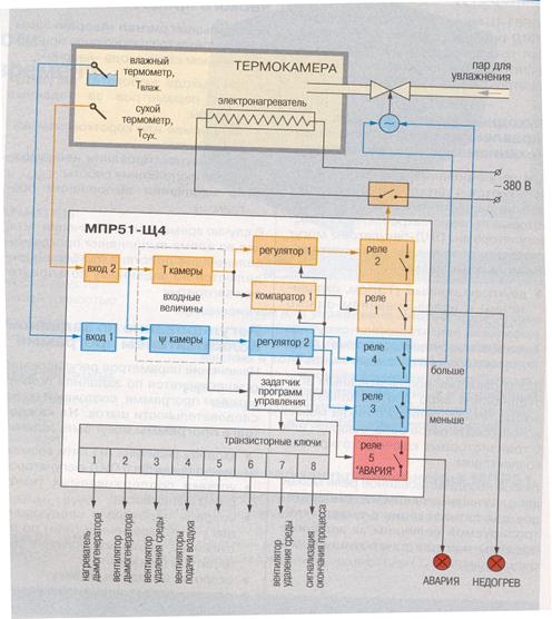 Технология изготовления некоторых вареных колбас требует соблюдения особого температурного режима, суть которого заключается в необходимости поддержания заданной разности температур ΔТ в камере (Т сух) и внутри продукта. Превышение этой величины может привести к разрыву оболочки батонов и порче продукции. Для выполнения условия ΔТ ≤ А, где ΔТ = Т сух – Т прод; А – максимально допустимая разность температур, в МПР51-Щ4 используется компаратор 1, который в случае превышения ΔТ заданного значения блокирует включение реле 2, подающего пар для нагрева камеры.