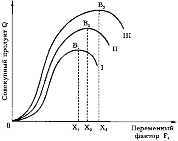 Проиллюстрируем это на графике (рис. 6.2). Максимально возможное использование переменного фактора в технологии I обозначим через Х1 Очевидно, что переход к технологии II позволяет увеличить количество переменного фактора до Х2 (Х2 > Х1), переход к технологии III — до Х3 и т. д.