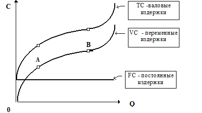 Графическим изображением постоянных издержек будет прямая линия FC, переменных издержек - кривая VC, характер которой определяется действием закона убывающей отдачи. Форма кривой переменных издержек зеркально отражает форму кривой общего количества продукта труда. Сначала переменные издержки растут медленнее объемов производства (до точки А), затем скорость их роста стабилизируется. Начиная с точки В идет опережающий рост издержек из-за нарушения оптимальных размеров предприятия.