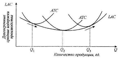 Кривая LAC огибает кривые средних краткосрочных издержек производства, касаясь их в точке их минимума.