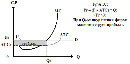 а) Если рыночная цена (P) сложилась на уровне, который позволяет фирме покрывать совокупные средние издержки (ATC) при данном (Q0) объеме производства, следовательно, от каждой поставленной единицы продукции фирма получает прибыль, а производство в объеме Q0 обеспечивает максимизацию прибыли (рис. 6.22).