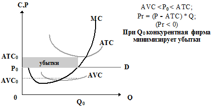 б) Если рыночная цена (P) сложилась на уровне, меньшем совокупных средних издержек (АТС), но большем переменных средних издержек (AVC), то необходимо осуществлять производство в объеме Q0. Если фирма не будет осуществлять предложение в этих условиях и прекратит производство, ее убытки будут больше на величину (P0 - AVC0) × Q0. Производство в данном объеме будет обеспечивать минимизацию убытков: доходы будут полностью покрывать переменные издержки и частично постоянные. Если предложение не осуществлять, то убытки, понесенные фирмой, будут больше: постоянные издержки не будут оплачены ни на копейку (рис. 6.23).