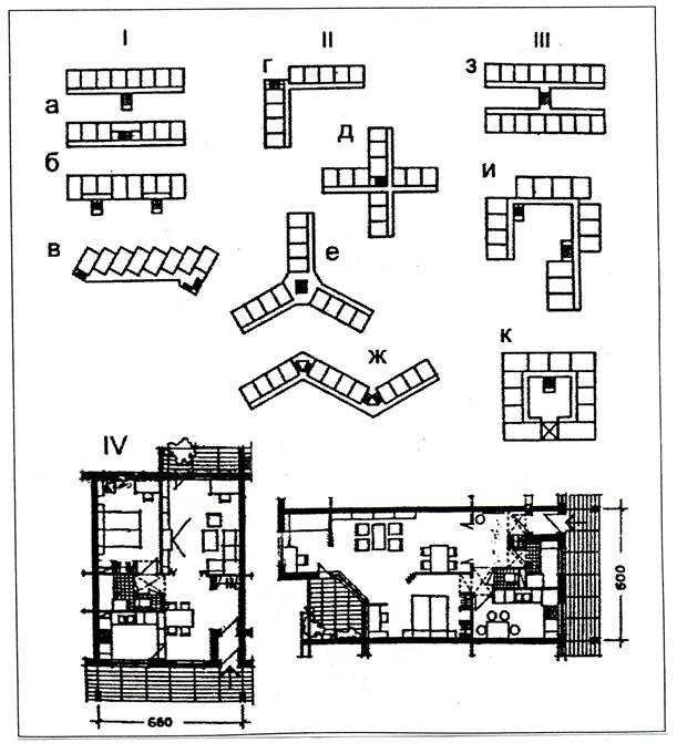 е – трехлучевой, ж – ломаный; з – спаренный; и – П-образный; к – с внутренним двором; IV – варианты двухкомнатных квартир