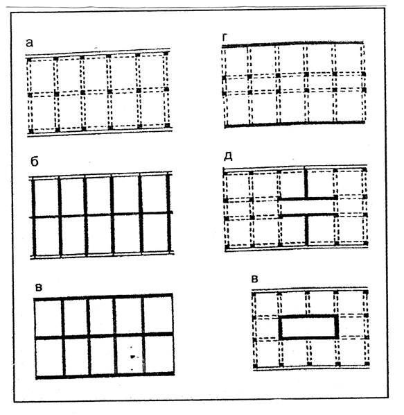 б – поперечные несущие стены; в – продольные несущие стены; г, д, е – комбинированные схемы