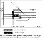 Как повлияет на общественное благосостояние в условиях «встречной торговли» изменение - понижение или повышение - импортного тарифа? Предположим, первоначально государство практикует запретительный импортный тариф, лишающий зарубежного продавца стимулов входа на наш внутренний рынок. Переход от закрытой к открытой экономике в результате отказа от запретительного импортного тарифа сопровождается как выигрышами, так и потерями благосостояния. Эффект чистого выигрыша возникает в результате понижения цены и соответствующего расширения потребительского излишка, а также увеличения объема собранных государством налогов; потери вызваны сокращением прибыли отечественной фирмы.