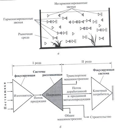 Рисунок 3 – Гармонизированные пары и негармонизированные звенья логистической цепи: «аквариум» с плавающими звеньями в рыночной среде (а) и логистические единицы I и II рода (б)