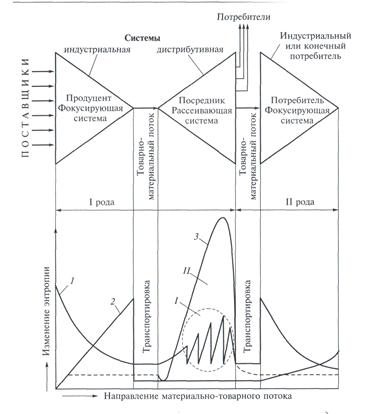 Субъектами рынка в материальном производстве и сбыте продукции являются два принципиально отличающихся класса систем. Одна из них – индустриальная, производящая продукцию (продуцент); ее можно отнести к производственным системам фокусирующего типа. Другая – дистрибутивная, не производящая продукцию; ее функция состоит в диссипации (рассеивании) продукции, выработанной первой системой, путем оптовой и розничной торговли, оказания услуг, складского хранения и распределения запасов и т. д.). Обе системы (индустриальная и дистрибутивная) связаны материально-товарным и информационным потоками. Обе они наравне с себе подобными системами функционируют в окружающей среде, представленной природной, предметно-продуктовой и информационно-психологической ее составляющими.