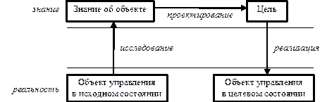 В процессе управления менеджер получает знание о реальных объектах, которыми он управляет (знание о том, что есть), исходя из него строит новое знание (что должно быть – это, в частности, определение цели) и претворяет это знание в реальности (рис.1.1.1). Первый этап из названных – исследование, второй – проектирование, третий – реализация.