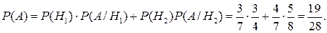 Пример. В первой урне находится три белых и четыре черных шара, а во второй – пять белых и два черных. Из первой урны во вторую перекладывается один шар. Какова вероятность того, что шар, вынутый наугад из второй урны, окажется белым?