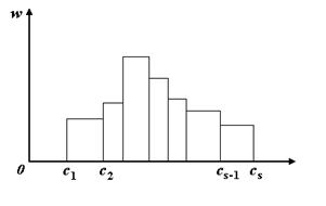 где (cs-1,cs) (или [ cs-1,cs)) – промежуток, которому принадлежат все возможные значения случайной величины X, а wi – относительная частота попаданий случайной величины X в данный промежуток.