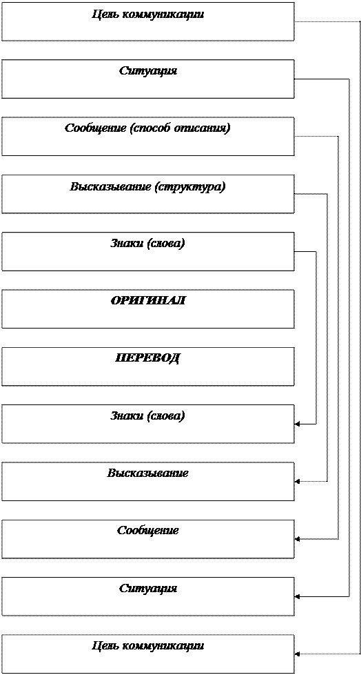 При анализе оригинала переводчик последовательно уясняет все уровни содержания оригинала от уровня языковых знаков вверх до уровня цели коммуникации.