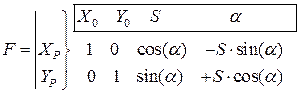 и матрицу Якоби F размера 2х4 (две функции XP, YP и четыре аргумента по которым берут производные – X0, Y0, S и a)