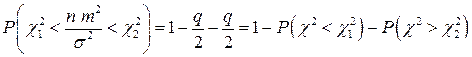 Рассмотрим построение доверительного интервала для дисперсии s 2 по выборочной дисперсии m2, полученной по n измерениям с нормальным распределением погрешностей. Выбираем доверительную вероятность P =1– q. Ранее было показано, что величина (n×m 2) / s 2 имеет распределение c 2 с k = n – 1 степенями свободы. Тогда можно записать