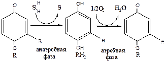 1). Анаэробная фаза. В этой фазе особые вещества хромогены (R) отщепляют Н от субстратов и восстанавливаются (RH2).