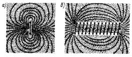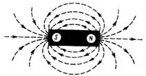 На рисунке 12.4 с помощью силовых линий изображены магнитные поля кольца с током, катушки с током, полосового магнита. Обращаем внимание, что силовые линии магнитного поля, в отличие от силовых линий электрического поля, являются замкнутыми линиями. Такие силовые поля называются вихревыми полями. То место источника магнитного поля, из которого силовые линии выходят, называют северным магнитным полюсом источника и обозначают буквой N, а то место, в которое силовые линии входят, называют южным магнитным полюсом и обозначают буквой S. При взаимодействии источников магнитного поля одноименные полюсы взаимно отталкиваются, разноименные полюсы взаимно притягиваются.