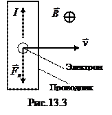 . На рис.13.3 представлен металлический проводник, в котором носителями тока являются электроны. Применяем правило левой руки для отрицательно заряженной частицы. Сила Лоренца направлена вниз вдоль проводника и является сторонней силой, работа которой