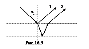 При падении светового пучка на тонкую пленку под углом α происходит его разделение на две волны, направления которых обозначены лучами 1 и 2 (рис.16.9). Волна 1 отражается от верхней границы пленки, волна 2 преломляется, отражается он нижней границы пленки, преломляется на верхней границе пленки и выходит из пленки. Эти волны являются когерентными волнами, которые образуются из одной первичной волны и проходят разный оптический путь. При наложении этих волн они интерферируют и результат интерференции зависит от оптической разности хода этих волн. Если на пленку падает белый свет, состоящий из световых волн разной длины волны, то условию максимума (16.6) при интерференции будут удовлетворять только волны какой-то определенной длины. Поэтому на поверхности пленки под разными углами зрения будут наблюдаться разноцветные радужные полосы. Эти полосы называются полосами равного наклона.