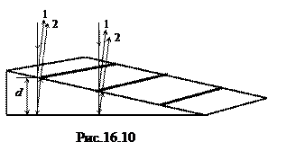 Если свет падает на пленку с переменной толщиной и отражается от нее (рис.16.10), то условие максимума (16.6) при интерференции лучей 1 и 2 будет выполняться только для определенных толщин d пленки. На поверхности пленки образуются яркие полосы, под которыми толщина пленки удовлетворяет условию максимума (16.6). Эти полосы называются полосами равной толщины. Если на пленку падает белый свет, то полосы будут иметь радужную окраску.