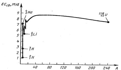 –5,3 МэВ), затем более медленно возрастает до максимальной величины 8,7 МэВ у элементов с А = 50–60 а потом постепенно уменьшается у тяжелых элементов (например, для