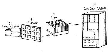 В качестве ТЭЗ в рассматриваемом варианте конструктивной иерархии используются ячейк и - прямоугольные печатные платы с разъемом (печатным или штыревым) и (возможно) ручкой, объединяющие до нескольких десятков микросхем. Ячейки монтируют в панели - металлическую конструкцию, имеющую в своем составе ответные части разъемов для ячеек, ответный монтаж, разводку питания и шины заземления. Несколько панелей монтируются в стойке, имеющей дверцы, закрывающие внутренний объем. Кроме панелей в состав стойки могут входить блоки питания, устройства вентиляции, блокировки и т. д. Несколько стоек (шкафов), объединенных электрически с помощью кабелей, образуют ЭВМ. Иерархию микросхема - ячейка - панель - стойка - ЭВМ (система) широко использовали в серии машин «System-360» фирмы «IBM» (США), многопроцессорной машине «Illiac-IV», в машинах ЕС ЭВМ и др.