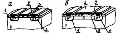 Рис 7.3. Структуры МДП-транзисторов с индуцированным (а) и встроенным (б) каналами: 1 — сток; 2 — затвор; 3 — оксид кремния; 4 — исток; 5 — встроенный канал
