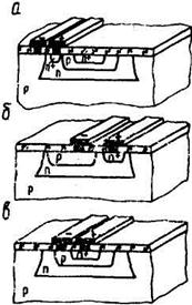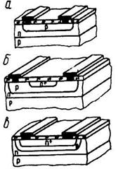 Рис. 7.5. Структуры диффузионных конденсаторов на основе р—п- переходов: а — изолирующего; б — коллекторного; в – эмиттерного