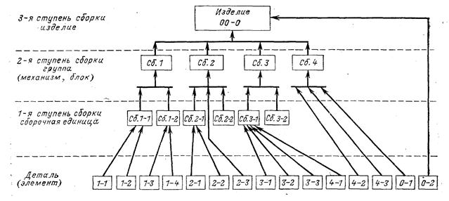Рассмотрим схему сборки веерного типа (Рис. 20.3). Она удобна при анализе состава изделия. Стрелками показано направление сборки деталей и узлов. Достоинством схемы является простота и наглядность, но она не отражает последовательность сборки.