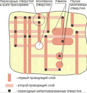 - переходные металлизированные отверстия (для электрического соединения элементов рисунка на проводящих слоях);
