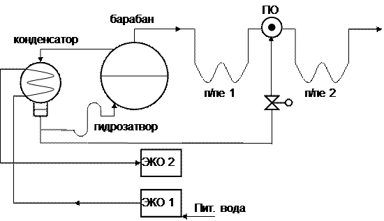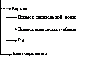 Надо обратить особое внимание на тот факт, что в данной схеме имеет место авторегулирование. Так при увеличении нагрузки увеличивается температура перегрева и значит надо увеличить расход воды на впрыск. С другой стороны при увеличении нагрузки увеличивается сопротивление пароперегревателя, уменьшается давление пара в пароохладителе и автоматически увеличивается расход воды на впрыск.