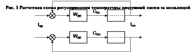 Температура за мельницей стабилизируется в заданных пределах путем воздействия на расход смеси холодного и горячего воздуха. Расчетная схема регулирования показана на рис. 60.