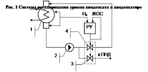 Обозначения: РУ – регулятор уровня; 1 – конденсатор; 2 – КЭН; 3 – рабочий клапан; 4 – клапан рециркуляции.