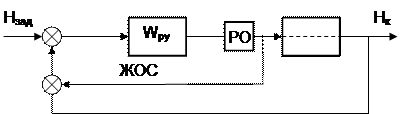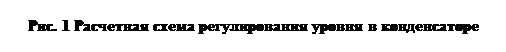 На регулятор уровня РУ поступают два входных сигнала – по уровню конденсата Нк и по положению регулирующего органа ЖОС. При снижении уровня вследствие сброса нагрузки турбины рабочий клапан 3 закрывается, но обеспечивает требуемый нерегулируемый пропуск воды в ПНД. При дальнейшем снижении уровня начинает открываться клапан рециркуляции 4, поддерживая уровень воды в конденсаторе. Для удобства управления и согласованности в работе клапаны 3 и 4 выполнены в одном корпусе и управляются одним исполнительным механизмом. Расчетная схема регулирования уровня в конденсаторе представлена на рис. 77.