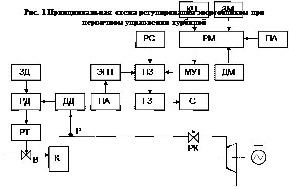 Обозначения: ЗД – задатчик давления; РД – регулятор давления; РТ – регулятор топлива; ДД – датчик давления; ПА – противоаварийная автоматика энергосистемы; ЭГП – электрогидравлический преобразователь; ПЗ – промежуточный золотник; ГЗ – отсечной золотник главного сервомотора; С – главный сервомотор; РС –регулятор скорости; МУТ – механизм управления турбины; РМ – регулятор мощности; ДМ – датчик мощности; КЧ – корректор частоты; ЗМ – задатчик мощности.