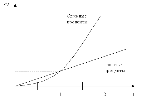 Графическая иллюстрация соотношения наращенной суммы по простым и сложным процентам представлена на рисунке 1.4.