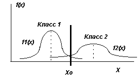 В простейшем случае для одной переменной и при двух классах процесс разделения можно представить графически на рис. 3.1. Если выборки признака Х, относящиеся к обоим классам, подчинены нормальным законам распределения с дисперсией σ и средними m1 и m2, то пороговая величина х0 позволяет оптимальным образом разделить признаковое пространство на две области: