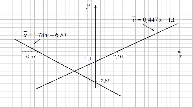 5) Построим линии регрессии (Рис.6). Для этого найдем точки пересечения линий с осями координат: