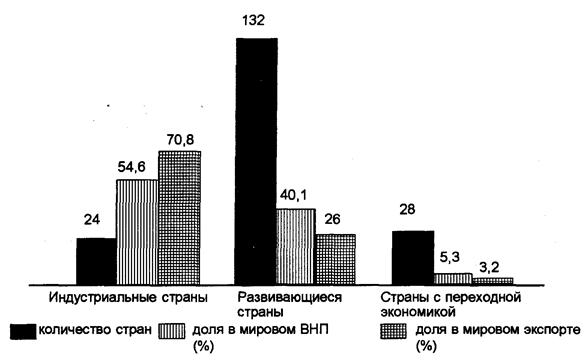 Из 184 стран мира, по которым к середине 90-х годов имелись сопоставимые данные о ВНП и экспорте, индустриальные страны играли ведущую роль, создавая более половины мирового ВНП и более ⅔ экспорта. Согласно прогнозам, роль развивающихся стран в производстве мирового ВНП и экспорте будет в ближайшие годы постепенно увеличиваться за счет сокращения удельного веса развитых стран. Удельный вес стран с переходной экономикой изменится незначительно.