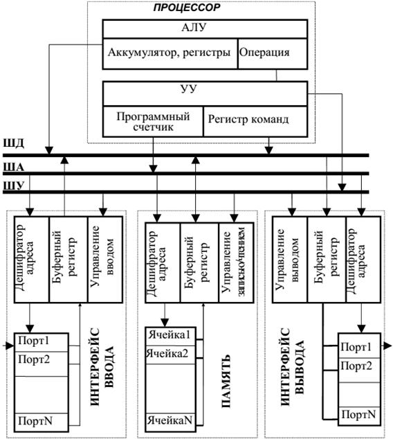 В МПС применяют специальные интерфейсные схемы для сопряжения периферийных устройств с системой (они показаны в виде модулей интерфейса ввода и интерфейса вывода). Основой этих схем являются порты ввода/вывода – схемы, спроектированные для обмена данными с конкретными периферийными устройствами. Порт – это адресуемый многорежимный буферный регистр ввода/вывода с выходными трехстабильными схемами, логикой управления и разъемом для подключения устройств ввода-вывода. Так же как и ячейки памяти порты пронумерованы, то есть имеют свой уникальный адрес.