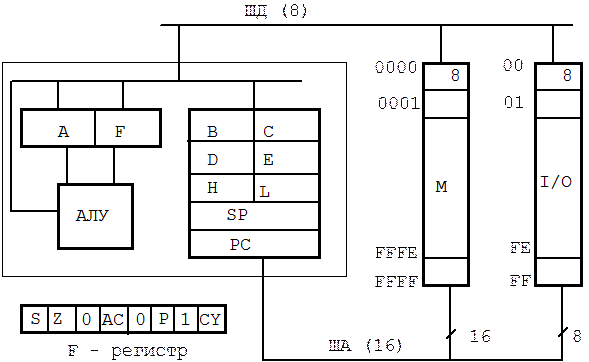 Программная модель показывает программно доступные части микропроцессора и микропроцессорной системы. Программная модель позволяет программисту проще ориентироваться в структуре микропроцессорной системы, не отвлекая его внимания на ненужные при программировании детали. На рис. 3.1 приведен пример программной модели микропроцессорной системы на основе 8-разрядного микропроцессора. На схеме показан микропроцессор и его программно доступные части: АЛУ, аккумулятор (А), регистр флагов (F), регистры общего назначения (B,C,D,E,H,L), программный счетчик (PC), регистр указатель стека (SP). Подробно описаны биты регистра флагов: S – бит знака (повторяет старший бит аккумулятора), Z – флаг нулевого результата (устанавливается, если в аккумуляторе 0), AC – флаг вспомогательного переноса (из младшей тетрады в старшую), P – флаг четности, CY – флаг переноса (из старшего значащего бита). На схеме показаны также память(M) и порты ввода/вывода(I/O).