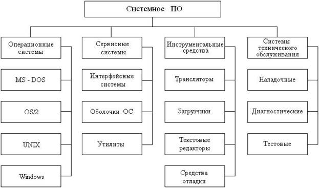 Системное ПО (рис. 48)предназначено для повышения эффективности создания программ обработки информации и их реализации на компьютере, а также для предоставления пользователям определенных услуг по работе с ресурсами компьютера.