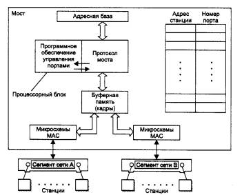 На (рис. 4.9) показана типичная структура моста. Функции доступа к среде при приеме и передаче кадров выполняют микросхемы MAC, которые идентичны микросхемам сетевого адаптера.